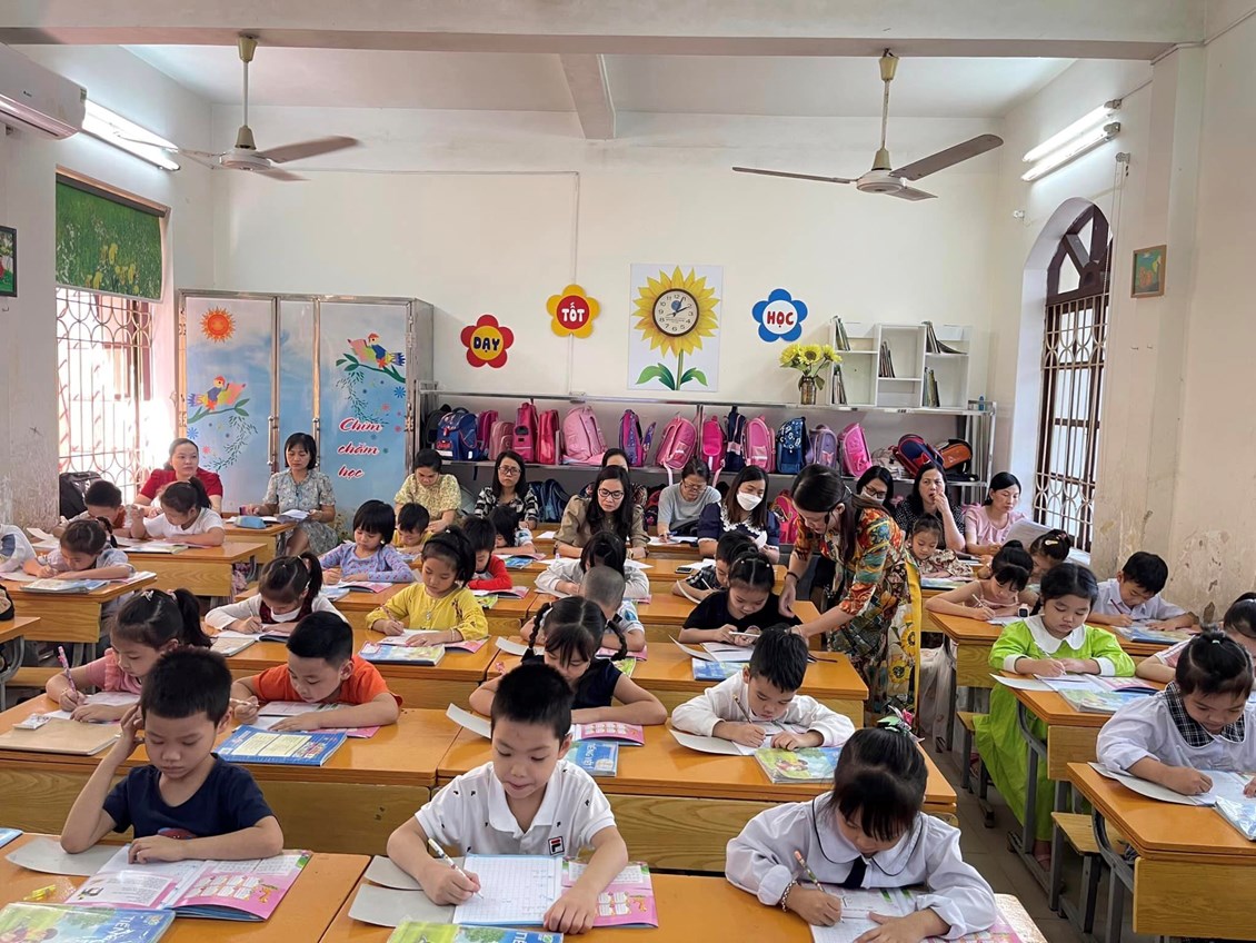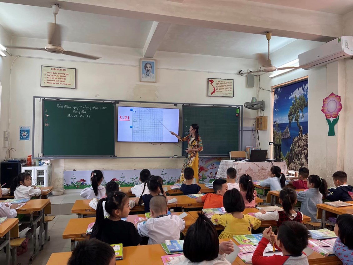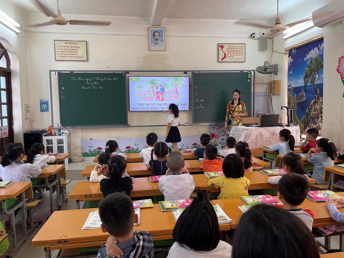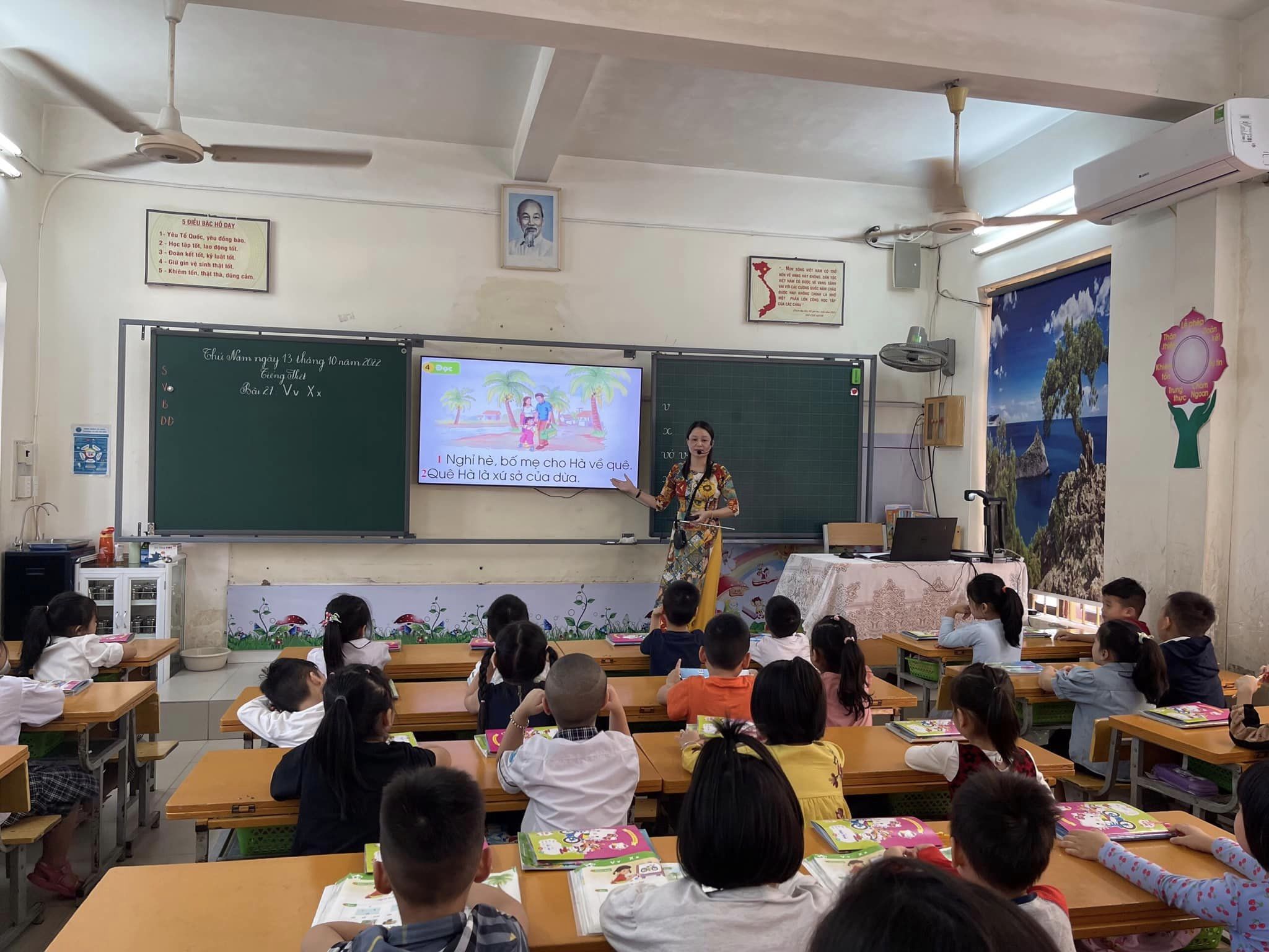 Đến dự với chuyên đề có các đồng chí Trần Thị Mị - Hiệu trưởng nhà trường, đống chí Cao Thị Hà - Phó hiệu trưởng, cùng toàn thể các đồng chí giáo viên khối 1. Phần lên lớp minh họa do đồng chí Hoàng Thị Thúy, giáo viên chủ nhiệm lớp 1A8 thể hiện qua tiết Tiếng Việt bài 27: âm V-x (tiết 2).