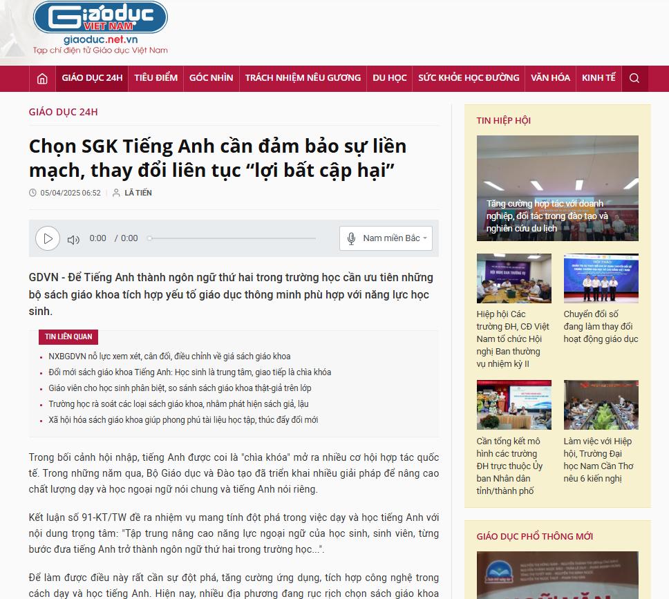 Bên cạnh đó, mỗi bộ sách giáo khoa có hệ thống ngữ liệu, triết lý, phương pháp giảng dạy khác nhau. Nếu thay đổi sách, giáo viên phải bắt đầu lại bằng việc tập huấn, giới thiệu lại phương pháp tiếp cận của cuốn sách. Đặc biệt, nếu thay đổi sách liên tục, học sinh, phụ huynh sẽ hoang mang. Vì thế rất cần sự ổn định trong việc sử dụng sách giáo khoa tiếng Anh.