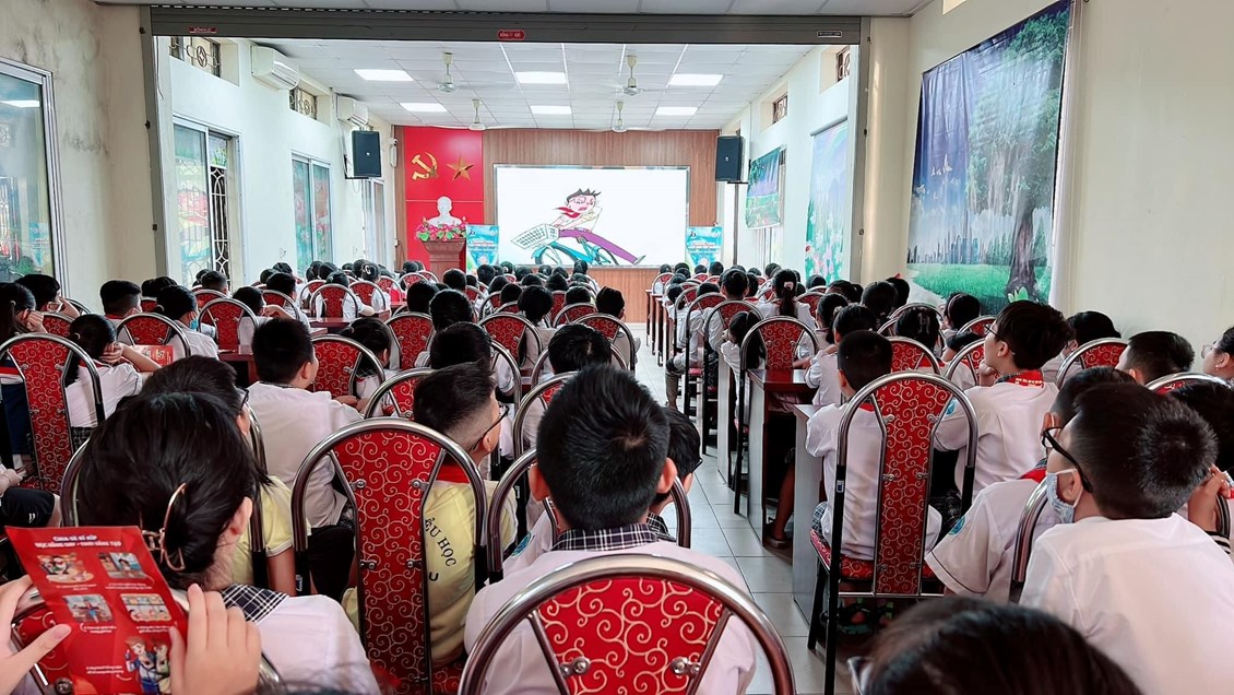 Thực hiện Kế hoạch số 758/KH-HĐĐ ngày 13/9/2022 của Hội đồng đội thành phố về việc tổ chức Chương trình “Điện ảnh trong mắt trẻ thơ” kết hợp hoạt động tuyên truyền sân chơi giáo dục cho thiếu nhi, học sinh, nhằm phát huy hiệu quả tổ chức các chương trình tuyên truyền giáo dục thông qua hoạt động chiếu phim học đường. Sáng ngày 18/10/2022, Liên đội trường TH Võ Thị Sáu đã tổ chức cho hơn 500 đội viên khối 5 tham gia Chương trình “Điện