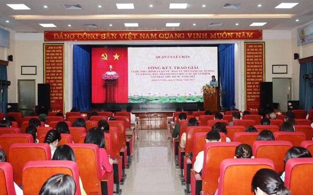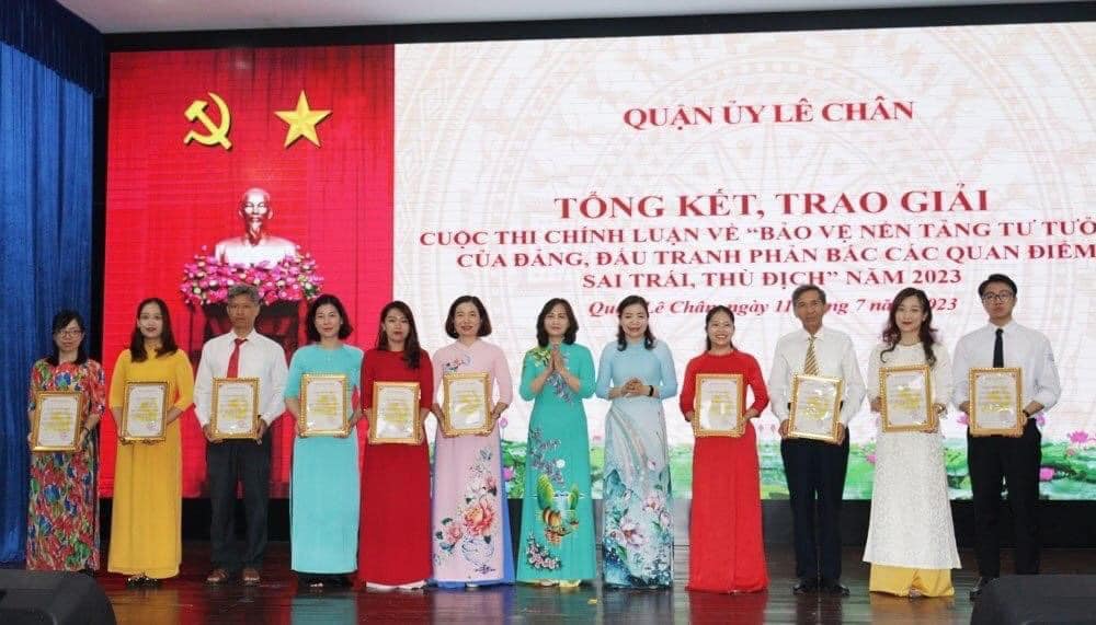 Sáng ngày 11/7/2023, Quận uỷ Lê Chân đã tổ chức tổng kết và trao giải cuộc thi Chính luận về “ Bảo vệ nền tảng tư tưởng của Đảng, đấu tranh phản bác các quan điểm sai trái, thù địch” năm 2023. Sau hơn một tháng phát động, Ban tổ chức đã nhận được hơn 2 nghìn tác phẩm ở các thể loại Báo in, Báo điện tử, Tạp chí, Phát thanh, Video Clip… từ các chi, Đảng bộ trực thuộc quận.