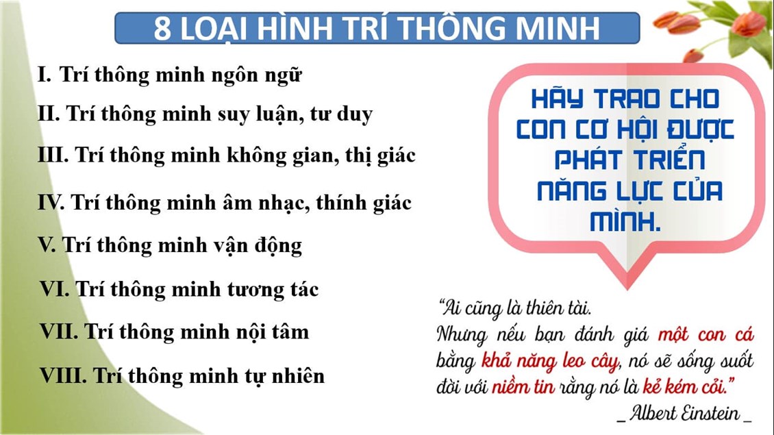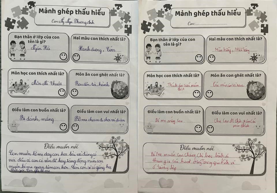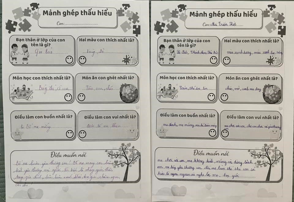 Đó chính là chủ đề của buổi họp phụ huynh lớp mình đấy. Trong buổi họp, qua trò chơi đổi vai cô đã gửi tới thông điệp: Hãy yêu thương các con đúng cách, đứng ở vị trí các con để hiểu được tâm tư của con trẻ và đứa trẻ nào cũng thông minh, hãy trao cho con cơ hội phát huy năng lực của mình. Các bố mẹ còn được trải nghiệm qua trò chơi: ”Mảnh ghép thấu hiểu”, để nhận thấy rằng mình yêu con chưa hẳn đã hiểu con.