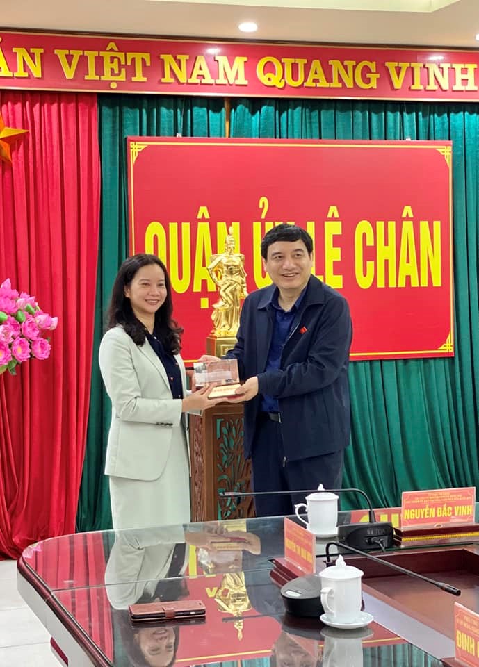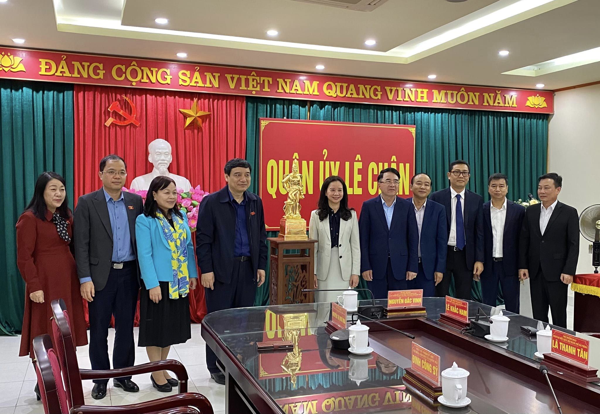 Tại buổi làm viêc, thay mặt Đoàn công tác, đồng chí Nguyễn Đắc Vinh, Ủy viên Trung ương Đảng, Chủ nhiệm Ủy ban Văn hóa, Giáo dục Quốc hội đã tặng quà cho Quận ủy Lê Chân.