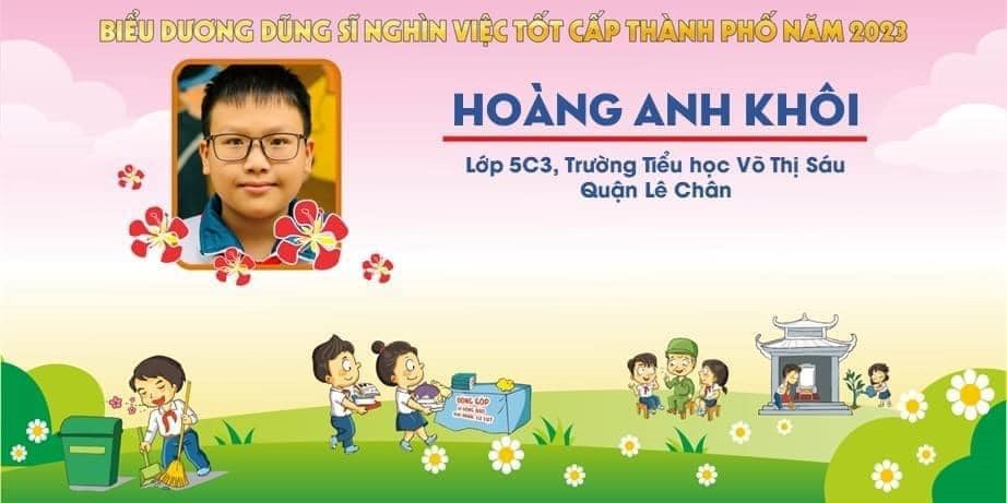 Thiết thực thi đua lập thành tích chào mừng Kỉ niệm 92 năm ngày thành lập Đoàn TNCS Hồ Chí Minh (26/3/1931-26/3/2023) và hưởng ứng kỉ niệm 60 năm phong trào “Nghìn việc tốt”. Thật vinh dự và tự hào cho Liên đội trường TH Võ Thị Sáu có em Hoàng Anh Khôi - chi đội trưởng chi đội 5C3 là một trong 60 “Dũng sĩ nghìn việc tốt” tiêu biểu. Hoàng Anh Khôi đã có thành tích xuất sắc trong thực hiện Phong trào “Nghìn việc tốt” trên lịch vực chuyển đổi số, được tham dự Chương trình Kỉ niệm 60 năm Phong trào “Nghìn việc tốt” (24/3/1963-24/3/2023) cấp thành phố.