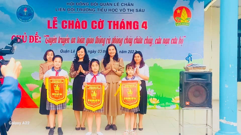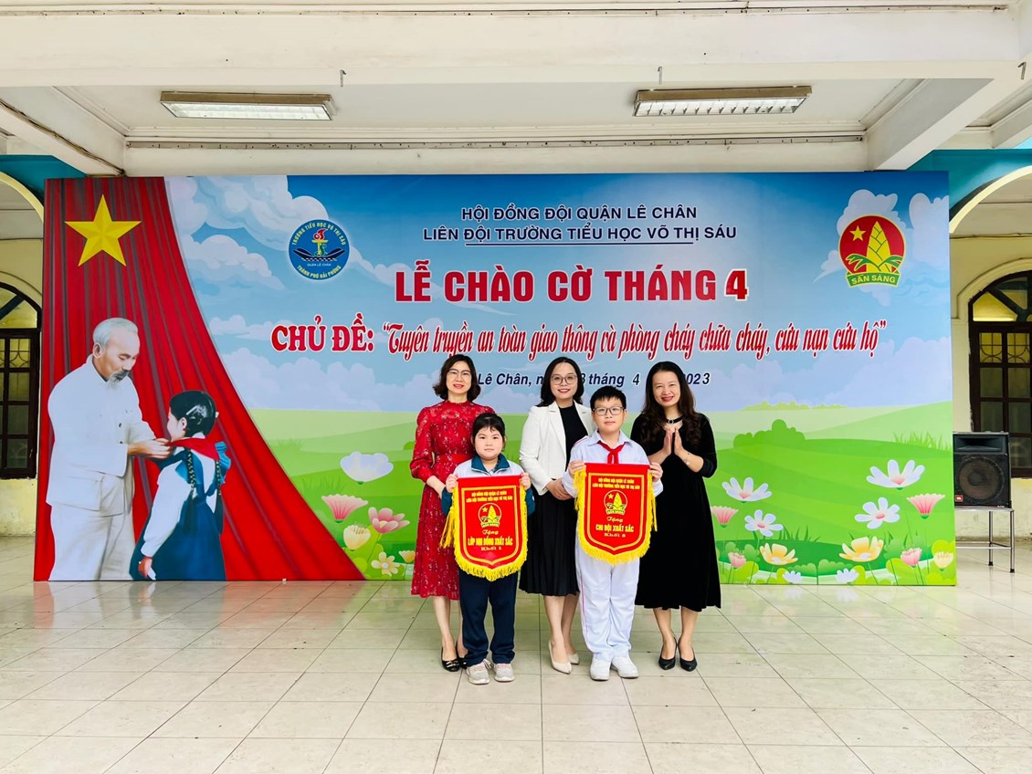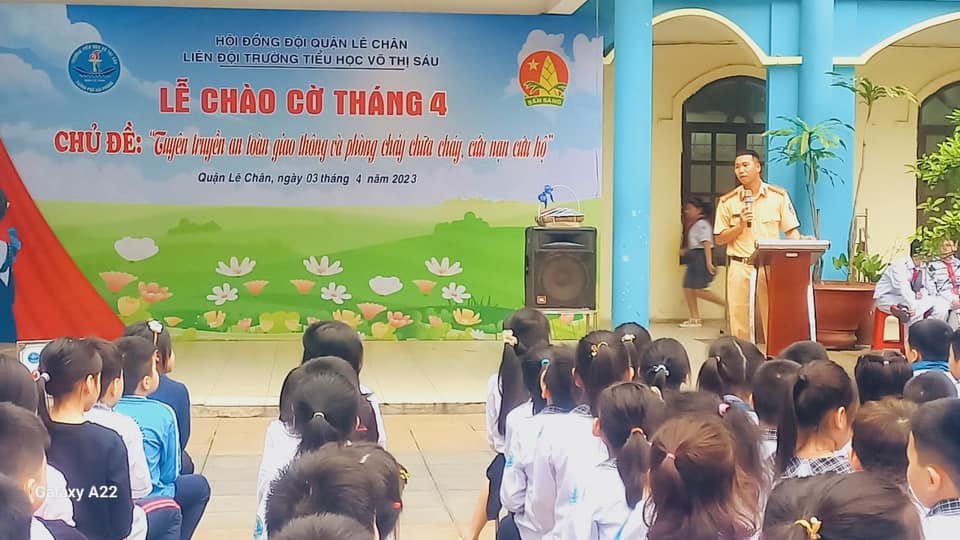 Ngày 03/4/2023, Liên đội trường tiểu học Võ Thị Sáu long trọng tổ chức lễ chào cờ tháng 4 với chủ đề: Tuyên truyền an toàn giao thông và phòng cháy chữa cháy, cứu hộ cứu nạn. Về dự với buổi lễ có các đồng chí công an quận Lê Chân; Nhà giáo Trần Thị Mị - Bí thư chi bộ - Hiệu trưởng nhà trường, cùng tập thể giáo viên, học sinh các khối lớp.