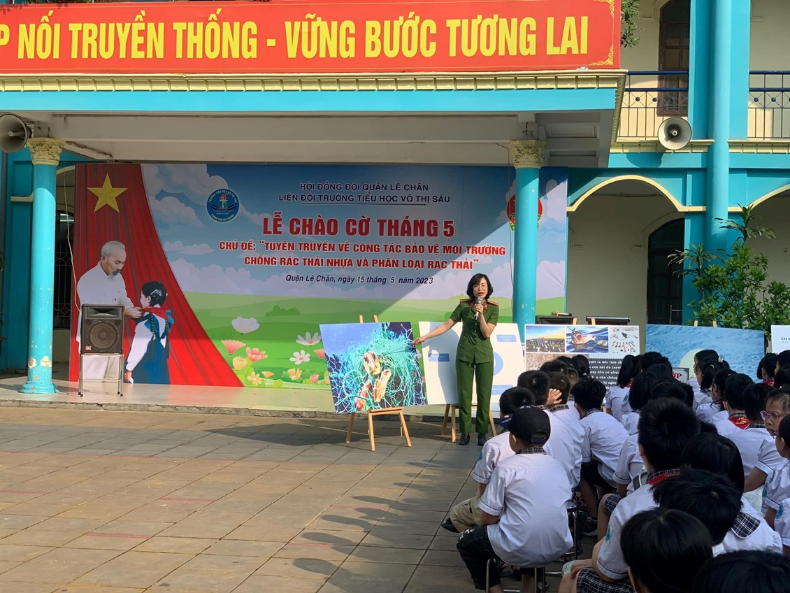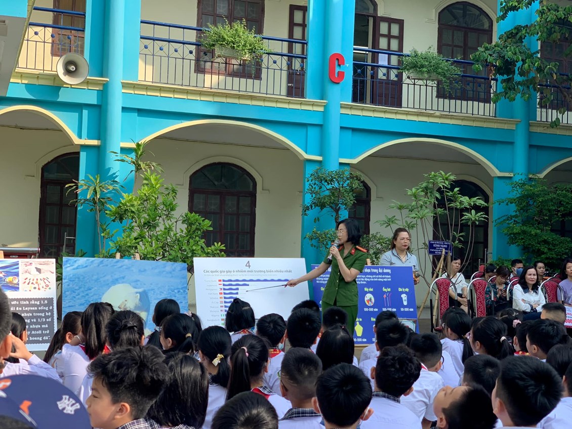Trong buổi lễ, các em được nghe phần chia sẻ của cô Nguyễn Thị Thuỳ Dương - phòng cảnh sát môi trường nói chuyện về công tác bảo vệ môi trường, chống rác thải nhựa và phân loại rác thải. Qua buổi nói chuyện các em đã biết cách phân loại rác thải, biết bảo vệ môi trường.