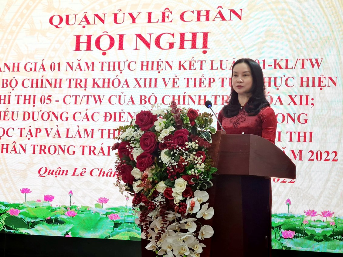 Sáng 03/12/2022, Quận Lê Chân tổ chức Hội nghị đánh giá 1 năm thực hiện Kết luận 01-KL/TW ngày 18/5/2021 về tiếp tục thực hiện Chỉ thị 05-CT/TW của Bộ Chính trị về “đẩy mạnh học tập và làm theo tư tưởng, đạo đức, phong cách Hồ Chí Minh”; biểu dương các điển hình tiến tiến trong học tập và làm theo Bác; tổng kết Hội thi “Lê Chân trong trái tim tôi” lần thứ IV năm 2022.
