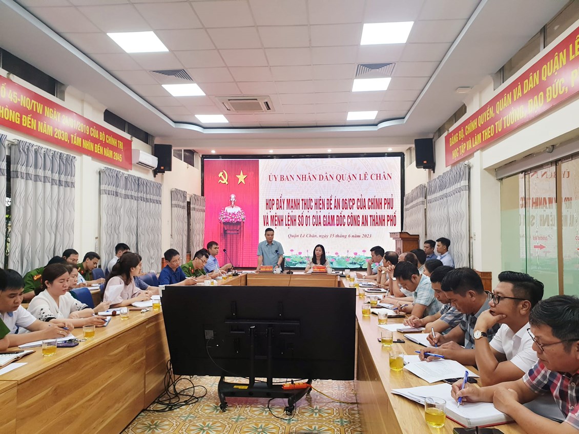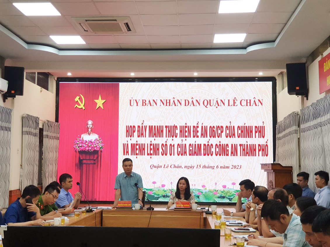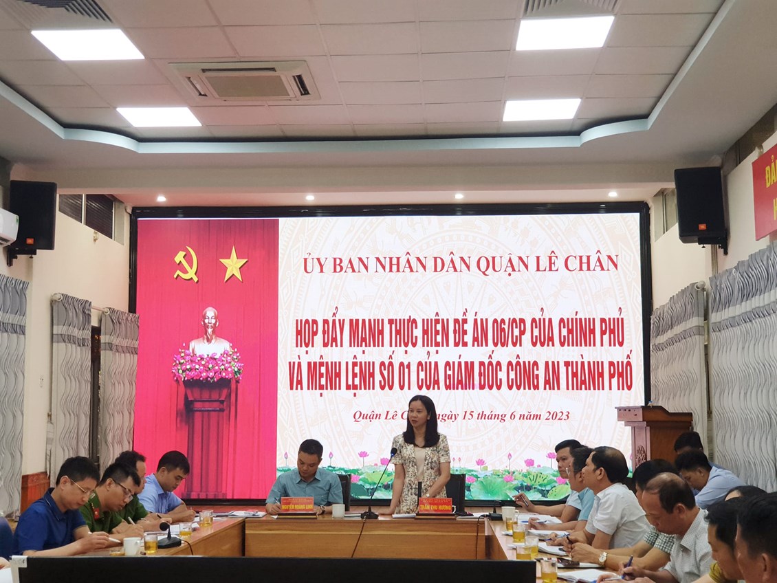 Chiều ngày 15/6, Quận Lê Chân tổ chức hội nghị họp bàn các biện pháp nhằm đẩy mạnh thực hiện Đề án 06/CP của Chính phủ và Mệnh lệnh số 01 của Giám đốc Công an Thành phố. Dự Hội nghị có các đồng chí: Trần Thu Hương – UVTU, Bí thư Quận ủy; Nguyễn Hoàng Linh – Phó Bí thư Quận ủy, Chủ tịch UBND quận; các đồng chí lãnh đạo UBND quận, Công an quận; Các đồng chí thành viên Ban chỉ đạo Đề án 06/CP quận; Bí thư Đảng ủy, Chủ tịch UBND 15 phường; và lãnh đạo Công an các phường...
