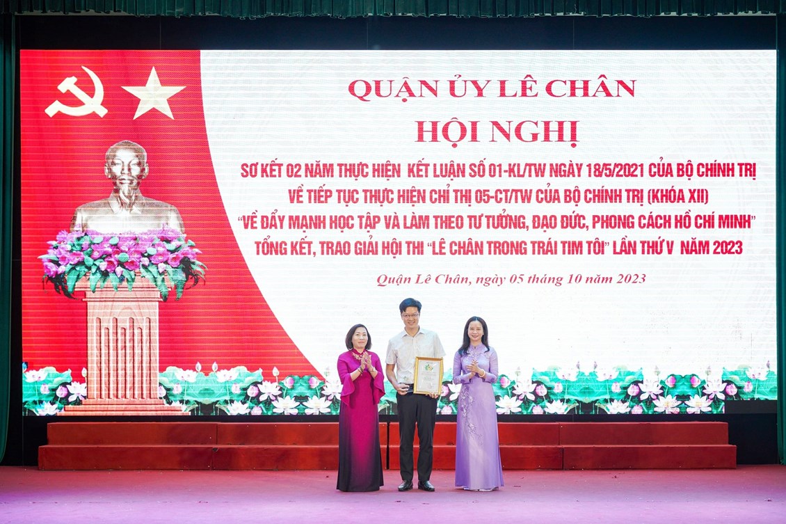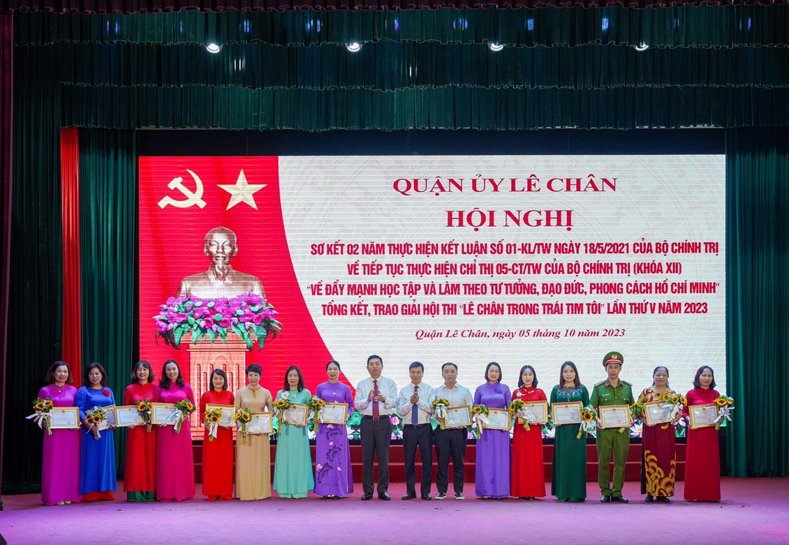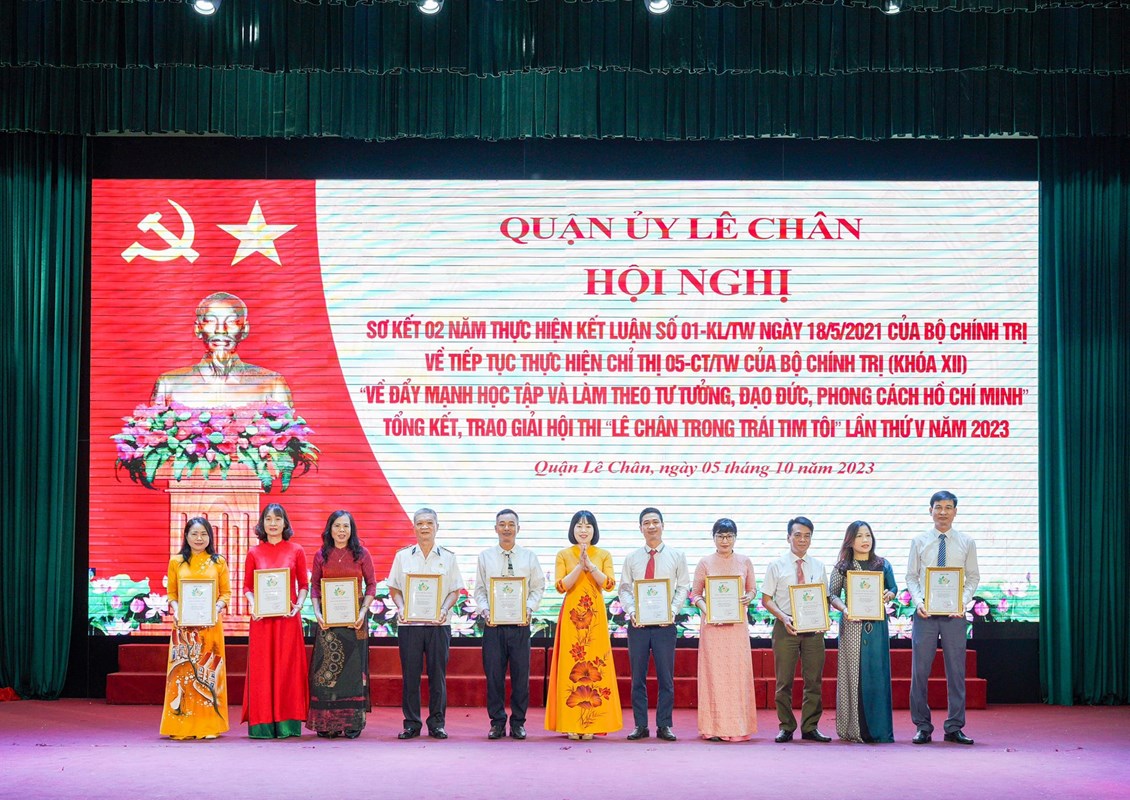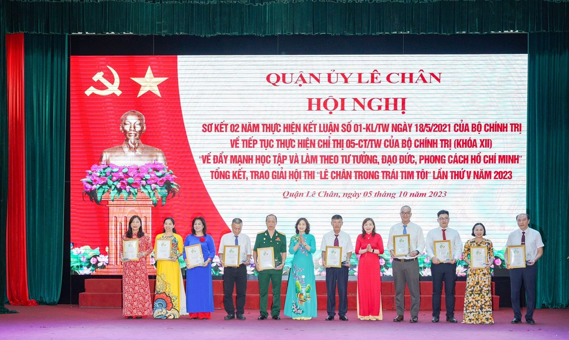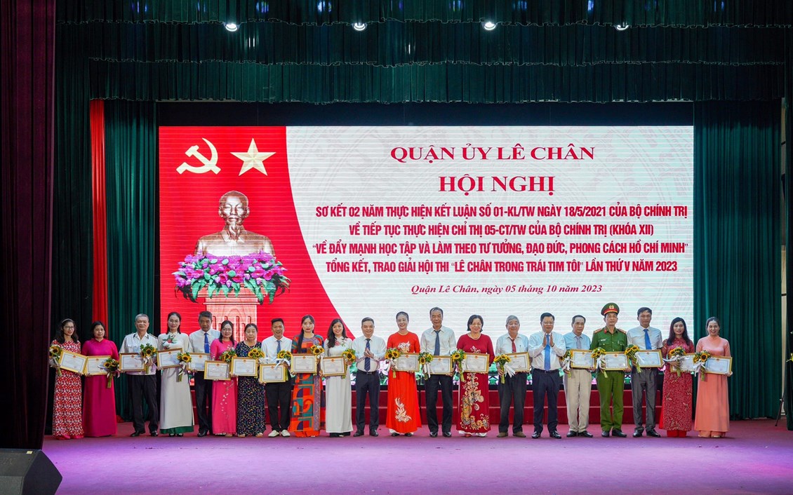 Sáng ngày 05/10/2023, Quận ủy Lê Chân tổ chức Hội nghị sơ kết 02 năm thực hiện Kết luận số 01-KL/TW, ngày 18/5/2021 của Bộ Chính trị về tiếp tục thực hiện Chỉ thị 05-CT/TW của Bộ Chính trị khóa XII “Về đẩy mạnh học tập và làm theo tư tưởng, đạo đức, phong cách Hồ Chí Minh”; biểu dương các điển hình tiêu biểu trong học tập và làm theo Bác; tổng kết, trao giải Hội thi “Lê Chân trong trái tim tôi” lần thứ V năm 2023.