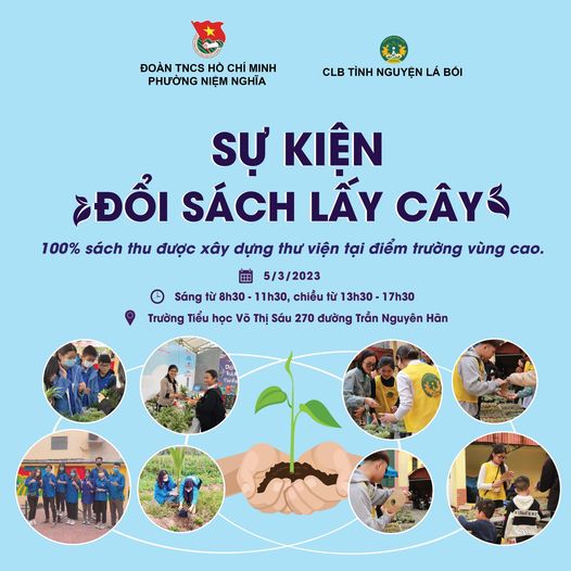Sự kiện "ĐỔI SÁCH LẤY CÂY 2023 " do Đoàn Thanh niên - Hội LHTN Việt Nam quận Lê Chân chỉ đạo Đoàn phường - Hội LHTN Việt Nam phường Niệm Nghĩa phối hơp cùng CLB tình nguyện Lá Bối tổ chức với chủ đề "Hành trình xanh 2023".
