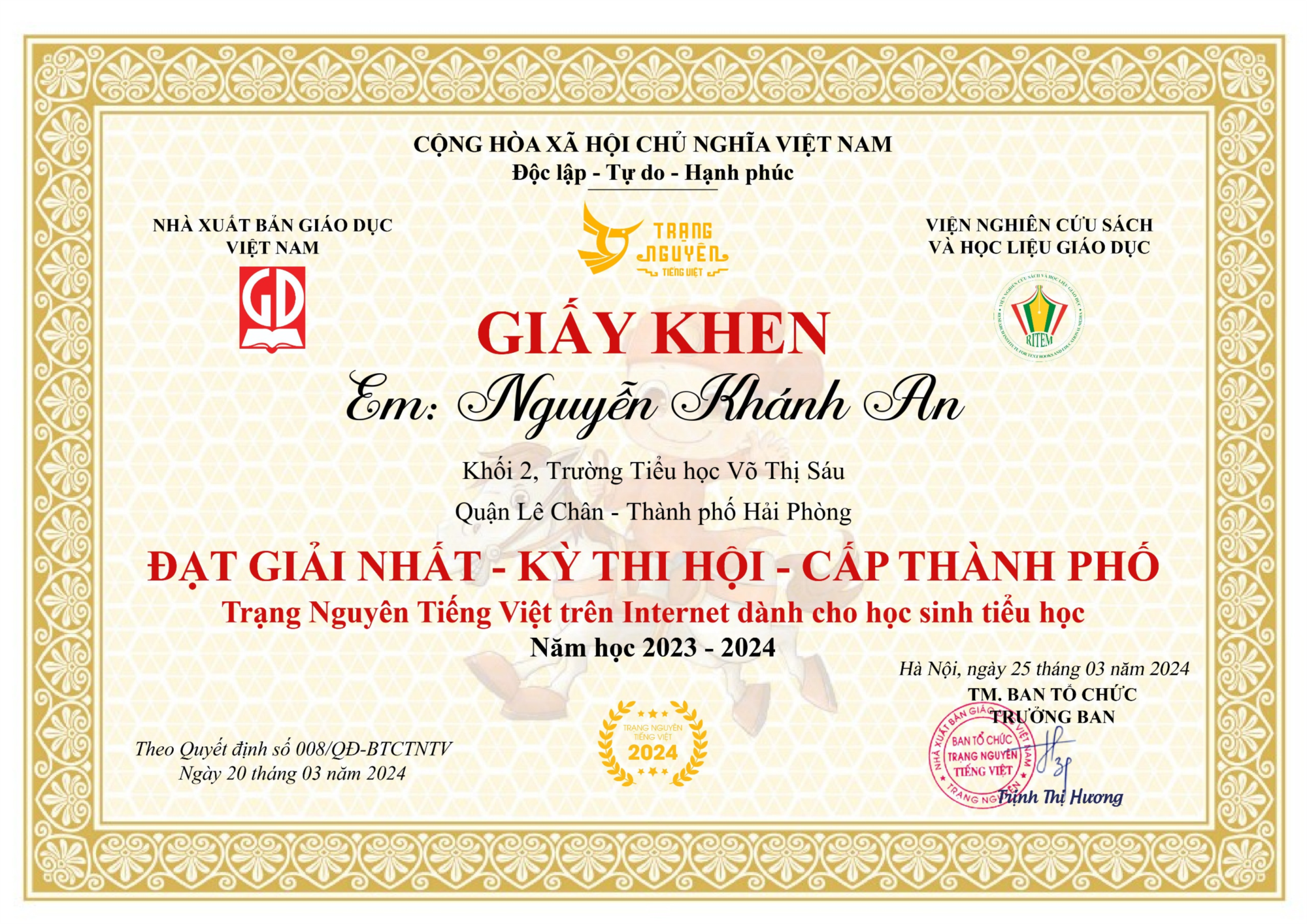Cũng như các năm trước, năm học 2023-2024, sân chơi Trạng Nguyên Tiếng Việt đã thu hút được đông đảo học sinh trường tiểu học Võ Thị Sáu tham gia ở tất cả các vòng thi. Tại kỳ thi Hội – cấp Thành phố, Trạng Nguyên Tiếng Việt trên internet dành cho học sinh tiểu học, nhà trường có số lượng HS tham gia tương đối đông từ khối 1 đến khối 5 và đã giành được 12 giải, bao gồm: 1 giải Nhất, 4 giải Nhì, 3 giải Ba, 4 giải Khuyến khích. Xin chúc mừng thành tích của các em!