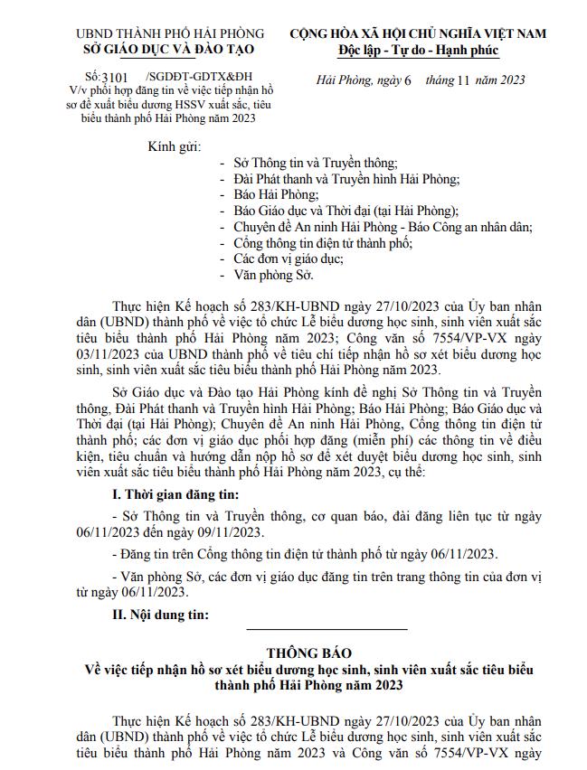Thực hiện Kế hoạch số 283/KH-UBND ngày 27/10/2023 của Ủy ban nhân dân (UBND) thành phố về việc tổ chức Lễ biểu dương học sinh, sinh viên xuất sắc tiêu biểu thành phố Hải Phòng năm 2023 và Công văn số 7554/VP-VX ngày 2 03/11/2023 của UBND thành phố về tiêu chí tiếp nhận hồ sơ xét biểu dương học sinh, sinh viên xuất sắc tiêu biểu thành phố Hải Phòng năm 2023. Sở Giáo dục và Đào tạo (GDĐT) thông tin về việc tiếp nhận hồ sơ đề xuất biểu dương học sinh, sinh viên xuất sắc tiêu biểu thành phố Hải Phòng năm 2023, cụ thể như sau: